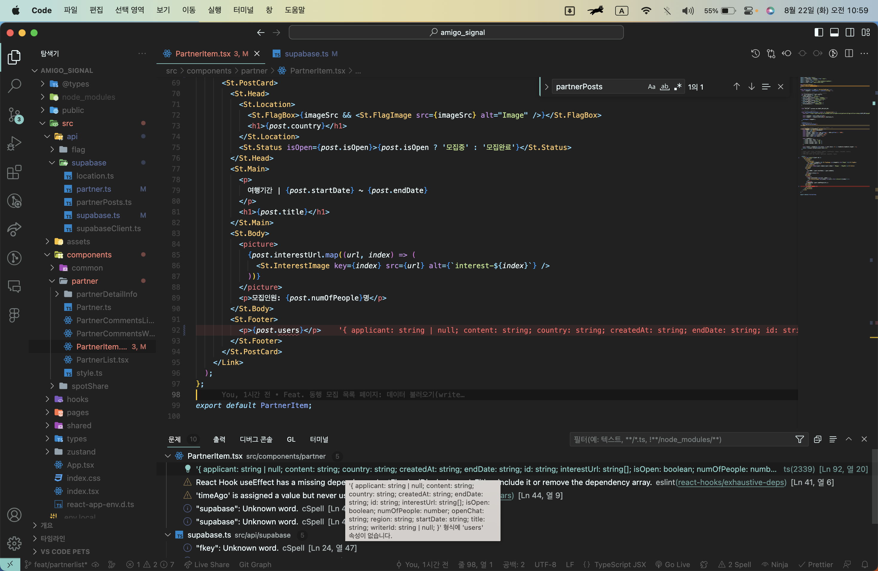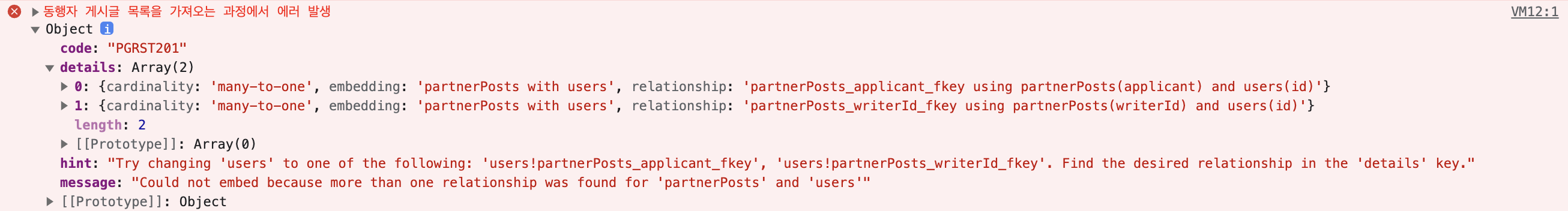 Supabase에서 partnerPosts 테이블과 users 테이블 사이에 "연결 관계가 2개" 있었음. 하나는 applicant, 다른 하나는 writerId.